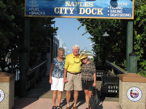 This is a picture of one of the resorts at Goodland - actually it is probably the only big resort. We went right up and out of Marco Pass because the tide was shifting and if we would have stayed on the inside we would have had the tide against us. So outside we went back into the calm seas. We popped into the Naples Pass only to find some cool marks. For any of my students who have followed us, they will see the Red over Green as a preferred channel mark. We took the red side which would mean we were heading to Naples. Naples is where we met back up with Larry and Joyce. Larry, as you remember, had joined us in the Bahamas and it was good seeing both him along with his lovely wife. You can see Larry, Joyce, and Deb below. |