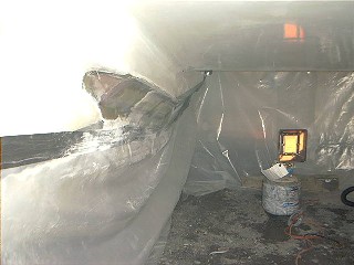 | These pictures show my wave slap fix in progress. The original owner of hull 536 and I were very good friends and we took the factory modification on the horizontal section and applied fiberglass with West Epoxy to make it a permanent fix. While we were doing this, I told him that I thought he should take the slant up the front of the hull to reduce the wave slap while underway or when you are at anchor with large waves. He didn't have enough time since they were getting ready to head to Key West and on to the Bahamas. When I bought the boat from him, two projects needed to be completed on the hull. First it had to be shaved because of the large amount of blisters that we found were voids in the hull. This project I farmed out to the boat yard and they did excellent work shaving, filling, coating and applying an Interlux 2000 barrier coat. The second project was to install the rest of the slap fix that we previously discussed three years ago. Of course, I volunteered him to help with the project. (It's nice when you buy a boat from a friend and stay friends!) Rob Hoffman did a similar fix with a marine instafoam. I used a solid sheet urethane foam which I sawed and shaped to fit. The urethane foam gave a nice flat surface without as much sanding. We were able to take it to the stage you see above before I had to have rotator cuff surgery. I had the yard final sand and apply the gel coat. The result turned out as expected and when my friends sailed with us they immediately noticed the reduction in noise while under sail |