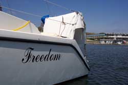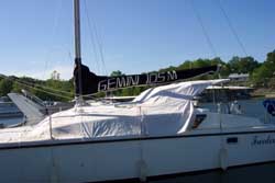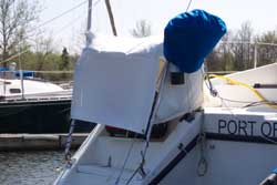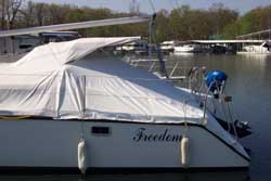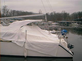 | We are docked in Kentucky near a company that loads coal on barges. I don't have the space to discuss the problems I had trying to get a cover made to keep the boat clean. I finally decided that if I can build an airplane, I can surely learn to sew and make my own cover. With that in mind I bought a Sailrite Sewing machine and lots of yards of Sunbrella and made a cover. The picture above is the cover in process. The pictures below show the completed cover. If you are wondering, This probably shouldn't be your first project sewing. It came out fine but if I made another it would come out better. This really doesn't matter since within 3 months it will be covered in coal dust. In case you are wondering, it takes about 30 minutes to put on. In the past, it took me 3 hours to clean off the dust after a week of being gone. Fair exchange. Note: May 4, 03 I was away for a month since finishing the cover. After removing it, it only took me 30 minutes and the boat was spotless. So the bottom line is I gained 1 1/2 hours for each weekend. Again, fair exchange. |