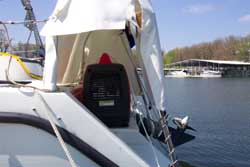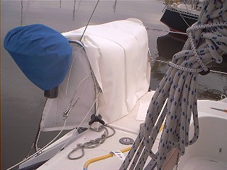 | I have one of the Honda 2000i generators that my friends affectionately call a Jim-a-rator. They say I'm a power hog but they do love it when the AC is running on an August evening of 100 degrees with no wind. Anyway, I decided that even though the noise was ok I could reduce it and also create a rain cover. The picture is a work in progress that I took while doing a final fitting. (I love that Sailrite Sewing Machine!) The cover has a foam interior enclosed in Sunbrella and it attaches with 1" webbing with snaps. After finishing up the generator cover, I was going to take some DB readings to see how much noise it reduced. I couldn't find my DB meter and I will need to borrow one. What I did was, standing in the same place using the same CD on the same passage of the same song, I turned up the stereo until I could just hear the music. With the cover on, I could hear it when the volume read 9 with the cover off, I could hear it when the volume read 16. I have a Standard Stereo/CD player that they sell at West Marine. I couldn't find spec's on volume. Still, it was a reduction and you can tell the difference. I'm guessing it was between 3 and 6 DB which is ok. I'll probably play with it more this summer to see where the noise is coming from and if I can change the design to enhance the deadening characteristics. |
