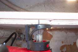 | While I had the shelf off, I decided I didn't like not knowing how full the holding tank was. At times we have 4-6 people on the boat for a long weekend and it has filled up. Instead of installing an access hatch cover, I decided to use some 1/4" plexi that I had and simply install a view port. The picture to the right shows the setting I used on the rotozip cutter to cut the access hole. I also put a metal cookie sheet between the plywood on the inside and the holding tank in case something slipped. | ![]() |