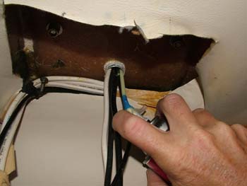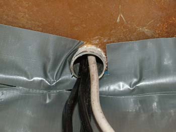 One night we were sleeping with a nice rain outside, well maybe it wasn't that nice because it was the leftovers from one of the Hurricanes in the summer of 2005. I woke up at anchor because of this drip, drip, drip on my head. No, I wasn't having torture at the time although I sometimes think that having a boat is torture because it always seems you are fixing something. This time the problem was tracked down to water coming into the boat from this tube going up into the mast. We headed back to the dock and since it was Sunday and still raining my only choice was to set up a drip system to catch the water while I called and emailed to see what the problem was. Fortunately a friend was staying down all week and said he would empty the bucket if necessary. |