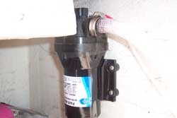 | I mounted the pump on the bulkhead using screws and washers. The pump mounts with vibration dampers. The wiring I paralleled off of the macerator pump that was up front (not used in Kentucky) and I knew we wouldn't use both at the same time. So, the #12 wire was spliced into and wired to the washdown pumps supply with it's own switch. | ![]() |