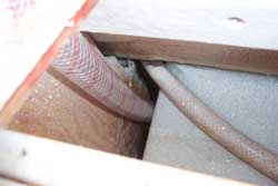 This picture shows the routing of the hose coming up from the tee (shown above) thru the shelf that will be reinstalled in the sail locker. I had to use a dremel tool to make a cut in that shelf, unscrew the screws and cut the 5200 before I could get it to come off. I then cut an access hole for the hose you see to the left and got the shelf ready to reinstall. But I didn't reinstall it yet because of a project that you will see below. |
