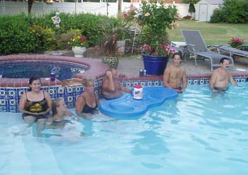 Everyone was staying cool in the pool but Mike talked me out of getting in too. Something about a one of a kind guitar that is plugged into an amplifier. Doesn't sound like a good mix does it. Water, electricity, and a one of a kind guitar. Instead, we simply played and did a bit of sweating. We stopped, took a break, had a great fried chicken diner and then back to work again. |