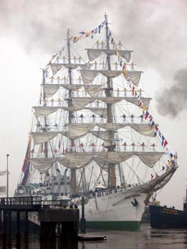 The Colombian ship actually let us go up higher and I was able to get the picture to the left. Looking down, you can see the green awning. Under the awning they play some soccer, basketball, and did their daily exercise. This ship was the same one you also saw through the water at the fountain. |