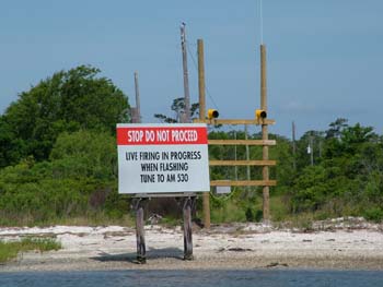 We anchored that night at Dutchman Creek which is just before you get to Cape Fear leading to Wilmington, NC. The name Cape Fear brings wild thoughts to your head about waves which will crush your boat. It just happens, Bill and Christy two days earlier had 6 foot waves they had to motor through to get up the river. They said they had salt all the way up their mast so I guess there might have been some fear involved. In our case, we left the next morning in calm winds and motored against the current to get through the area. This was a LONG day for us. I had gotten us underway at 6:25 am and we went until 5:30 pm that evening. We anchored at Mile Hammock Bay which is at Camp Lejeune Marine Corps Base. You can't go ashore but it is a good anchorage. We simply grilled some chicken wings and were in for an early night. The next day we went by these guns and also a target range for tanks. Of course you do want to duck when they are firing.... They actually close the waterway. |