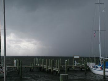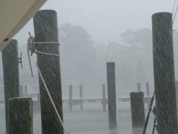October 22 - We've been working on the boat while waiting for parts to show up. As you might remember, I just had the boat surveyed so I could get new insurance. As a result, the surveyor found three things that weren't life safety items but thought should be fixed. First, you can see to the right the diesel fill hose had once clamp on each end. It was installed this way from the manufacturer. He said there should be two clamps on each end. And now, so there are. Next, I had to remove a number of the outlets installed in the boat and ensure they were all protected with Ground Fault Interrupters (GFI's) which should have meant purchasing two GFI's and having the other outlets down the line tied to the load side. Well, they didn't wire our boat so this will work so, I ended up putting in three GFI's so far and still need to add another one. I guess there are a few hidden junction boxes I haven't found yet. We've also been cleaning the outside of the boat and reworking our Polyglow. Polyglow is like wax but shines better and provides a better protection for the boat. Problem with it however, is that it gets dirt ground into it and after about a year or so you have to remove part of the old stuff and then reapply. For many that is a pain and reason not to use it. I talked to the guy at Polyglow about it and he said if you wash the boat often you shouldn't have to do this. I don't know about you, but when you are cruising washing the boat is hard unless you are in a marina. So, I just take off part and put it back on. By they way, you can see below that a storm came through on one of the days and between the wind and rain, it was a good one. I just got 3 more lines on between the dock and the boat when the 40 knot winds hit. |
