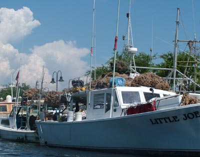I put the dinghy engine on after calling the City Marina because they said it was no problem for us to tie up to their docks. Great, another adventure. We had about a mile and a half dinghy ride and most of it was at idle speed and against the current. In the picture to the left you can see the sponge docks which now are about 50% "working boats" and the other 50% tourist type of boats. Below I got a couple of pictures of sponges being dried on the decks of two boats. |