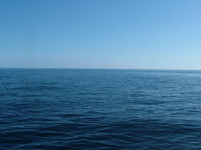 Deb had gone back to bed and arose again at about 8:30 am. She took over the watch so I was able to get about an hour and a half nap. So far, neither one of us have seen another boat since we left this morning. We settled into a routine where we set the egg timer for 10 minutes and when the beep, beep, beep would sound, the person on watch would get off of the couch, head outside and check 360 degrees for other boats, obstacles, and the engine instruments to ensure everything was ok before coming back in and resting the timer. Then we were back to a wicked card game, watching a movie, or reading a book. So far we have motored and motor sailed which always helps our speed some and conserves on the fuel. We have elected to run the engine slightly slower than normal specifically for fuel savings. The higher fuel prices have impacted everyone even wimpy ponytail sailors. When we were 80 miles across, with 80 miles to go to land, we were met by a dolphin. He just happened to be paying attention to our watch schedule and came by to visit when I was making the routine checks. I called out DOLPHIN and Deb came a running. I went in to pick up the camera and went back to try and get a picture. Fortunately, the water was about a clear as gin so the pictures did come out. This guy just came by to say Hi and then he was gone. |