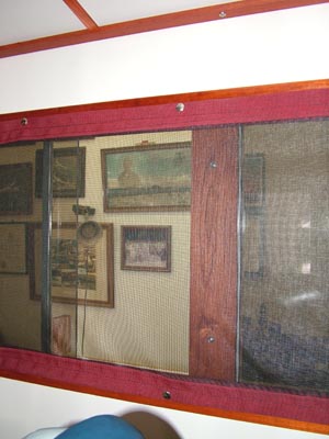 This picture shows the cording attached to a second piece of material which will be wrapped around the bug screen. You can see the first piece sewn to the screen lower left. Why the blue tape? The blue tape was my idea to give us a way to sew the material exactly where we wanted it on the screen. We first taped the screen to the window then we used the blue tape to establish the edges of the window. Next we measured in from the edge of the window and established the sew line. The amount we measured in was to allow the cording to lay on top of the window trim. You might be wondering why the cording. That idea came about because most bug screens allow bugs to get in. I've not seen too many bugs go around tight corners so that is what we came up with. The picture you are looking at on the lower right is with the first screen installed and it is taken from outside Paul's boat. You can see the cording wrapped in material laying on top of the trim. This is on the outer portion of the boat and you can see the bug screen going upwards. |