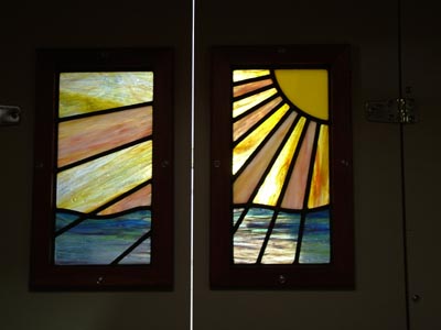 Next I took some pictures of the cabinet he made inside their berth which is forward of the steering station. If you look below left you can see a picture of the stained glass Paul made while he was in Florida last year. I took this picture laying down in the space that will be their berth. As you can tell lower right, the stained glass windows were installed in the doors leading to the berth. In addition, you can see the helm station along with the chair for Pat to use as they explore all the rivers and lakes in their future. |