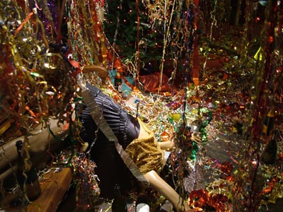 As we were waking, Deb let us know here back was giving her a very bad time so we slowed down. Ultimately we made it up to Sloppy Joe's where they will be dropping the Conch shell at midnight. There is also the drag queen drop in a red slipper up the street and back down at the water of course there is the requisite lowering of the winch from the mast of a schooner. Don't you just love Key West. On New Years Eve, people walk up and down Duval. Although at seven, the crowds aren't as thick as they will get as it gets later. We managed to get a picture of Deb with the local pirate. This guy gets out of his dinghy every day at about 10 am and walks on his peg leg down to Duval in costume so tourists can pose with him and give him a tip. We stopped by Caroline's to say hi to a couple of people and show Mike and Liz the best hangouts. While there, we caught the picture you see to the lower right of one of the people that was ready to celebrate in full costume tonight. |