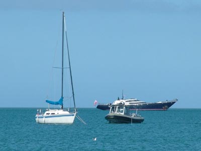 The problem is we are going to be working in a fairly densely anchored area and in deep water. So I have to get the anchors set just right to provide for spacing between boats. In the end, it took me three different times working with both anchors to get everything looking just right. I have my danforth set 200 feet to the south and had to use the dinghy to take the Rocna out 150 feet to the north. Then we set the Rocna and bring both lines forward to attach to the ring at the bottom of my mooring chain. (That is an 8 foot chain with a ball on top, shackles for the lines that attach to the boat, then a swivel, chain, shackle attaching the ring for the lines to attach to.) Ok, after anchors were set, I then was able to move Freedom where it was 150 feet from each anchor and attach that mooring system. Everything went in the water and the boat was moored properly just before the 15 knot winds arrived with the front that is starting to pass through the area. After I was finished, my friend Lee came up and asked if I was sure we were out of the restricted area and I explained where he could anchor. He moved his commercial fishing boat to the west of me which is less protected than I am and in even deeper water. However, he has big anchors and lots of chain so he was able to get his boat anchored before dark with two anchors. As he was finishing up, another boat anchored further out than Lee. The land grab is in process and he who waits, will be anchoring in horrible areas or paying 290 per month to use the city mooring field. So as I write this on Wednesday morning, all looks good. We will have the front moving to the north tonight and will be able to see if we get some protection from those shallows afterall. As you can see in the picture above right, we are further from Key West. Also, that big boat in the picture on the left and the right will also have to move. Where will they go? Probably someplace temporary and the race to get my spot when we leave in three or four months. Deb and I considered lots of options and one we could have exercised because of the Gemini's shallow draft we didn't have to do. However, we may if we return to Key West again in the future. My guess is that Key West will be less visited by cruisers because of the very limited anchorage that will be available. Probably, people will be essentially forced to use the mooring field. Of course the problem with the mooring field is you really get beat up when fronts come through because of the lack of protection. I heading off in a few minutes to pick up a package which we hope is our water heater being returned and then off to post this update. I'm sure you are thinking, its about time something really interesting happened! More later. |