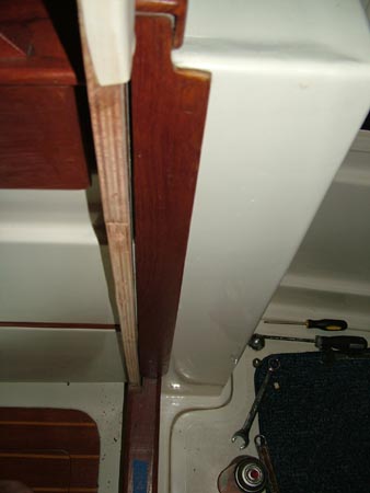 To remove the pivot bolts you MUST remove the trim going into the head and into the main stateroom. Once you get all the trim off, you can then get access to the bolt head. Here is the real secret to a wonderful project. First you have to get those thick shims so that you can jam 4 shims between the centerboard and the hull in 4 places. Two forward and two aft. Then you need a floor jack that you use blocks to get high enough and then jack it up until the 2 by 6 you have on the jack comes into contact with the centerboard. Then pump it up just a bit to take all the weight off of the centerboard bolt. Below you can see some pictures of the teak board that is used as a large washer along with the 5200 that is used to seal everything. Unfortunately, everything doesn't stay shimmed. |