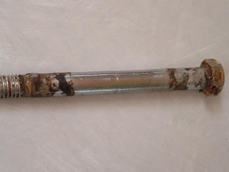 You can see that we have cleaned up the hull and the bottom paint looks really good. Bottom line is that we really didn't have to do this but since we pressure washed off a bunch of paint and I HAD to haul the boat, then why not paint the thing. Now for the real reason that we hauled the boat. The pivot bolts. |