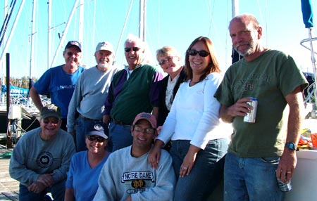 Oct 26 - We left. I'm going to go back to yesterday and fill you in on us leaving but the bottom line is that I'm updating the site right now as we pass the Rock Quarry heading south on Kentucky Lake. Rewind to yesterday. On Friday I had worked out a deal on another boat and received an offer from a buyer in Colorado Springs, CO for a nice boat we have at the marina. Bottom line on that contract was I received the sellers signature on Sunday evening and got everything done that I could and turned in my phone and door card. What resulted from the work I was doing is I got further and further behind. So the windows ended up getting finished with a gaggle of help from my friends which turned into a going away dock party/working afternoon. From top left to right it is Jim, Bennett, Deb, Julie, John and lower left to right is Gary, Ann, and John. Picture below is same group but with me in the pic. These are all great people and friends. It was a nice way to end our stay at Green Turtle Bay. |