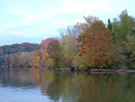 As we were heading out of their well marked channel for the Tennessee, once again I got the welcome of the fall foliage. We turned up river and started to make miles. I don't think I've said much about the current but it is now at least 1 knot on our bow. We've been averaging about 5 knots over ground and later in the day we were down to 4.6 to 4.7. Of course it is going to rain buckets for the next few days so it is looking more and more like we are on the longest trip ever from Green Turtle Bay to Pickwick. Oh well, the company is good and we have enough food to feed ourselves for about 3-4 weeks. This way we can help the local economy in Columbus when we restock. Of course now that we are underway wanting to make miles, the CSX Johnsonville Railroad decides this is a good time for a couple of trains to go by. One in each direction. I guess since they own the track and the bridge I should just smile and enjoy watching a couple of trains. Remember when you used to do that as a kid and enjoyed it? Guess what, I guess I'm a kid again. |